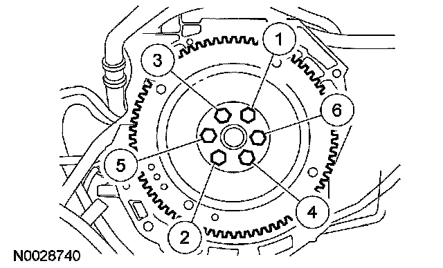 136. Install the flexplate and the 6 bolts. Tighten the bolts in the sequence shown in 3 stages: