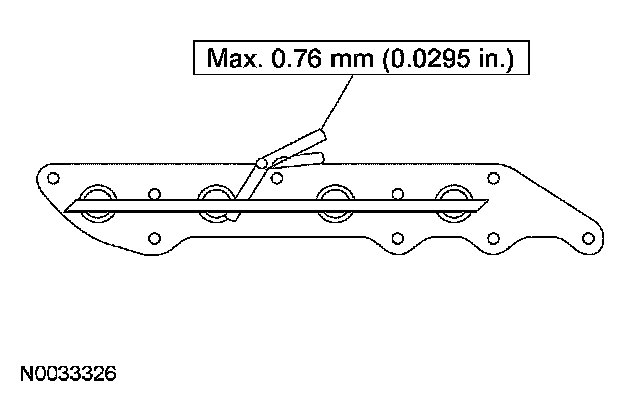 ^ Using a straightedge and a feeler gauge, place the straightedge across the catalytic converter flange surface and check for warping with the feeler gauge. If the reading is greater than the maximum specification, install a new catalytic converter, gasket and nuts.