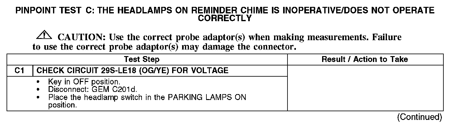 PINPOINT TEST C: THE HEADLAMPS ON REMINDER CHIME IS INOPERATIVE/DOES NOT OPERATE CORRECTLYC1: