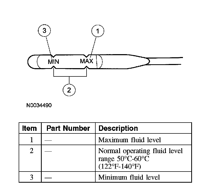 CAUTION: The vehicle should not be driven if the fluid level is below the bottom line on the fluid level indicator and the ambient temperature is above 10°C (50°F).