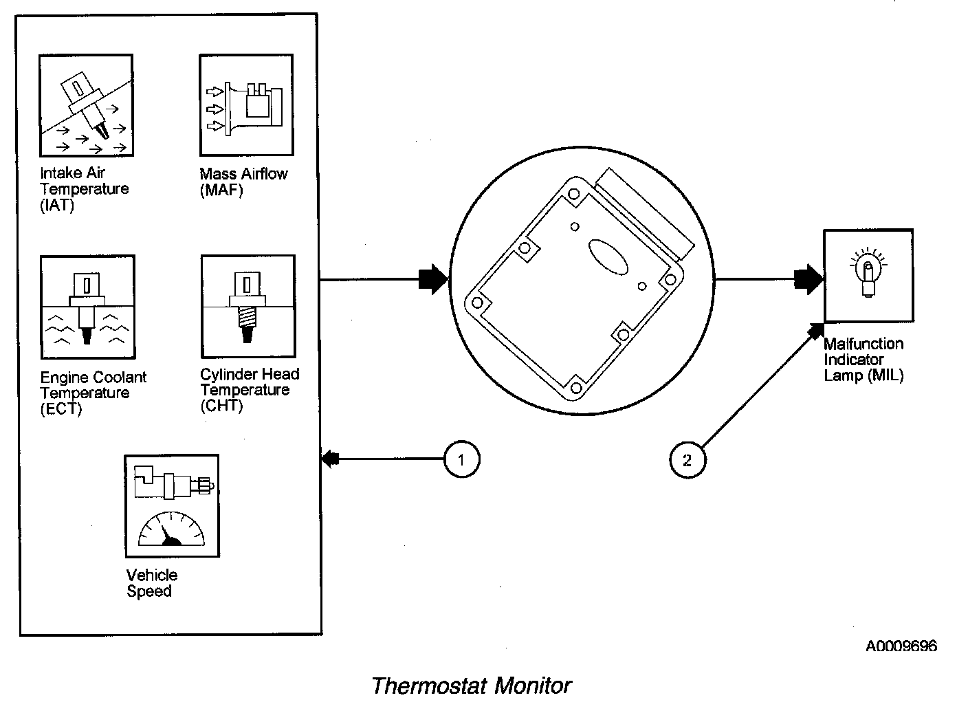 The thermostat monitor is designed to verify correct thermostat operation. This monitor is executed once per drive cycle and has a monitor run duration of 300-800 seconds. If a concern is present, DTC P0125 or P0128 is set and the malfunction indicator lamp (MIL) is illuminated.