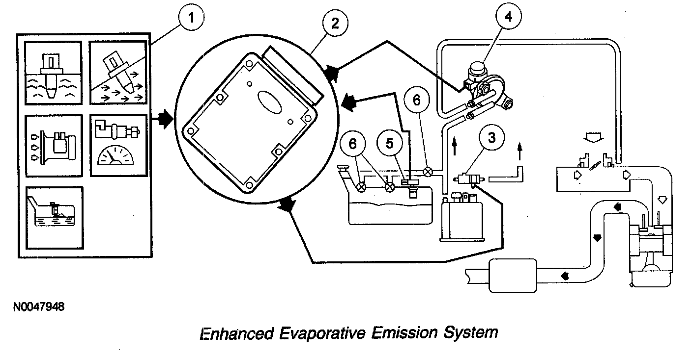 The enhanced EVAP system consists of a fuel tank, fuel filler cap, fuel tank mounted or in-line fuel vapor control valve, fuel vapor vent valve, EVAP canister, fuel tank mounted or fuel pump mounted or in-line fuel tank pressure (FTP) sensor, EVAP canister purge valve or vapor management valve (VMV), intake manifold hose assembly, EVAP canister vent (CV) solenoid, powertrain control module (PCM) and connecting wires, and fuel vapor hoses.