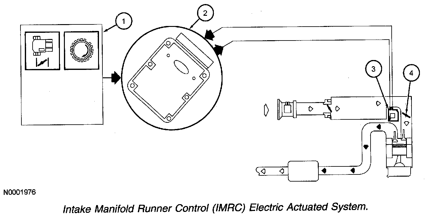 The IMRC electric actuated system consists of a manifold mounted motorized actuator and a PCM controlled electric solenoid. The linkage from the actuator attaches to the manifold butterfly plate lever. The IMRC actuator and manifold are composite/plastic with a single intake air passage for each cylinder. The passage has a butterfly valve plate that blocks a large percentage of the opening when actuated, leaving the top of the passage open to generate turbulence. The housing uses a return spring to hold the butterfly valve plates open. The vacuum actuator houses an internal monitor circuit to provide feedback to the PCM indicating the butterfly valve plate position.