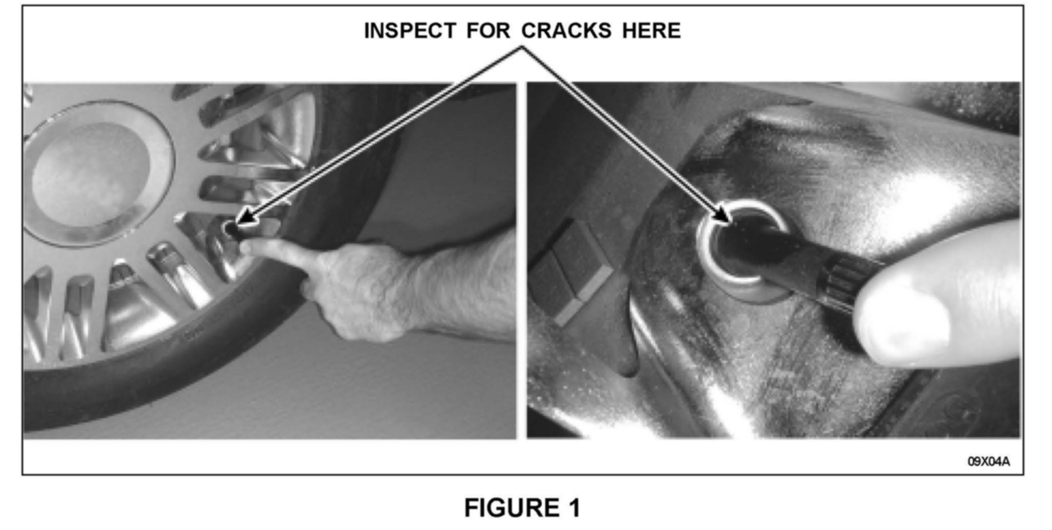 To inspect the valve stems, apply light pressure to the valve stem cap with your finger and inspect the surface ofthe valve stem. Look for surface cracks at the base ofthe valve stem and listen for any slow air leak. See Figure 1.
