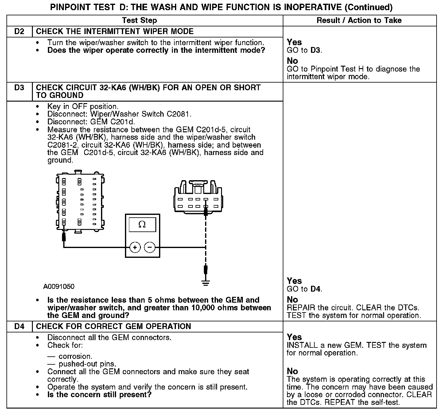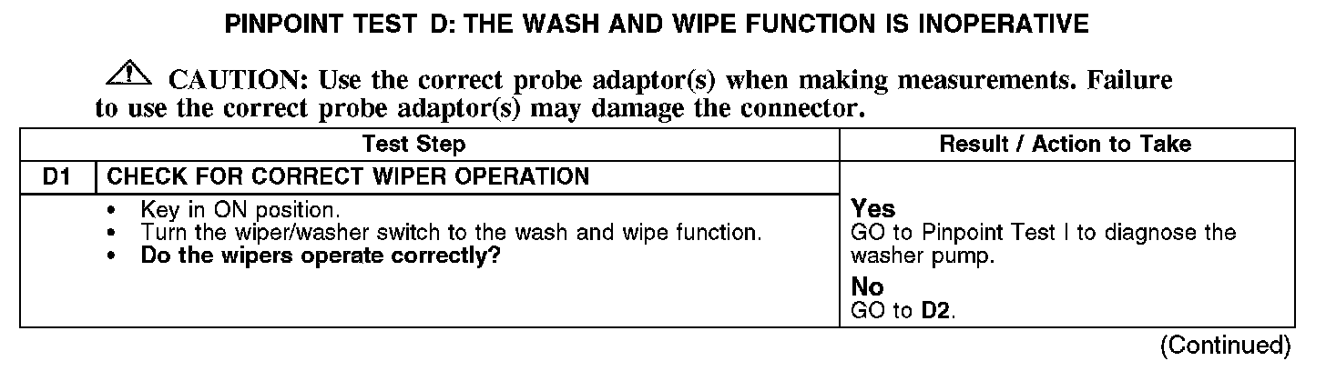 PINPOINT TEST D: THE WASH AND WIPE FUNCTION IS INOPERATIVED1: