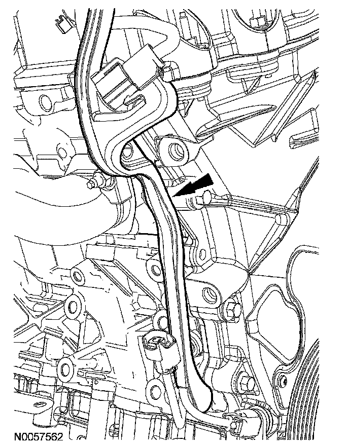 123. If equipped, attach the wiring harness retainer to the LH valve cover stud bolt.