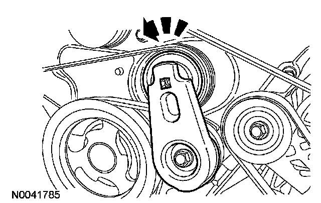 107. Rotate the accessory drive belt tensioner counterclockwise and install the accessory drive belt.