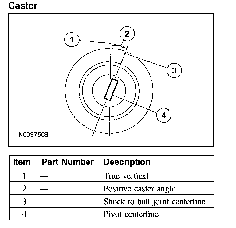 Caster is the deviation from vertical of an imaginary line drawn through the ball joints when viewed from the side. The caster specifications will give the vehicle the best directional stability characteristics when loaded and driven. The caster setting is not related to tire wear.