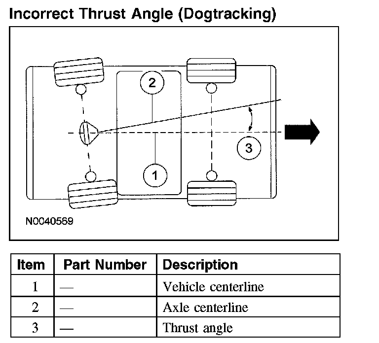 Incorrect thrust angle (dogtracking) is the condition in which the rear axle is not square to the chassis. Heavily crowned roads can give the illusion of dogtracking.