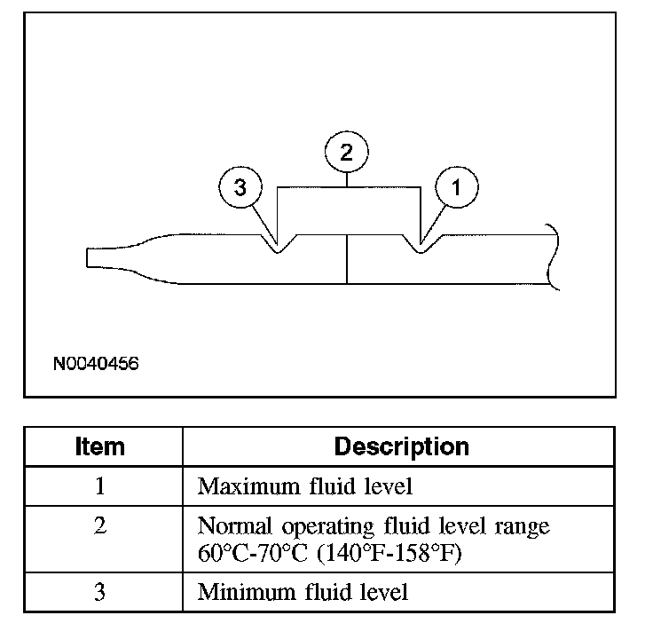 NOTE: The transmission fluid should be checked at normal operating temperature 60°C-70°C (140°F-158°F) on a level surface. Normal operating temperature can be reached after approximately 32 km (20 miles) of driving and can be checked using the scan tool.