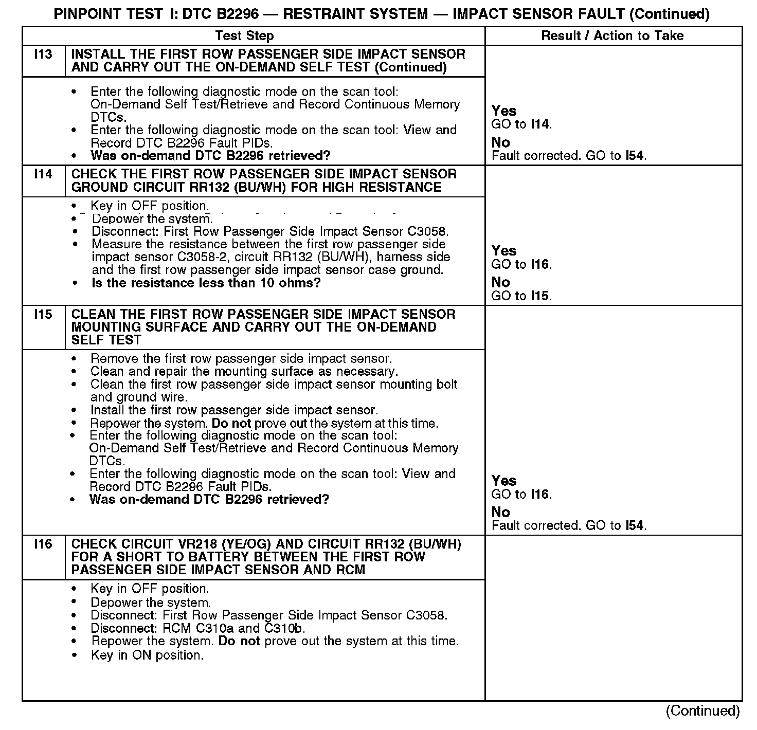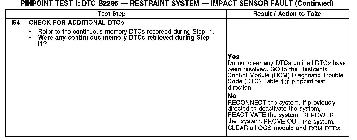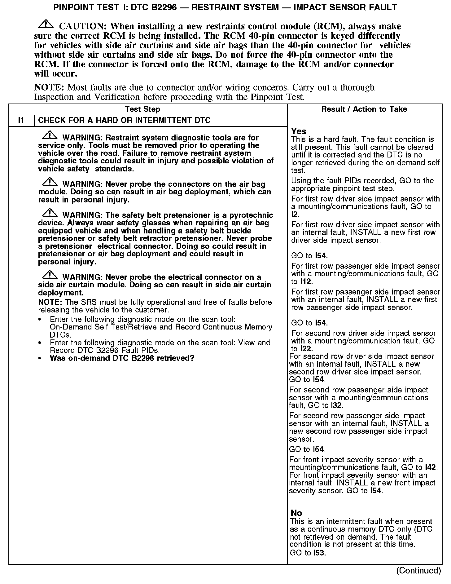 PINPOINT TEST I: DTC B2296 - RESTRAINT SYSTEM - IMPACT SENSOR FAULTI1: