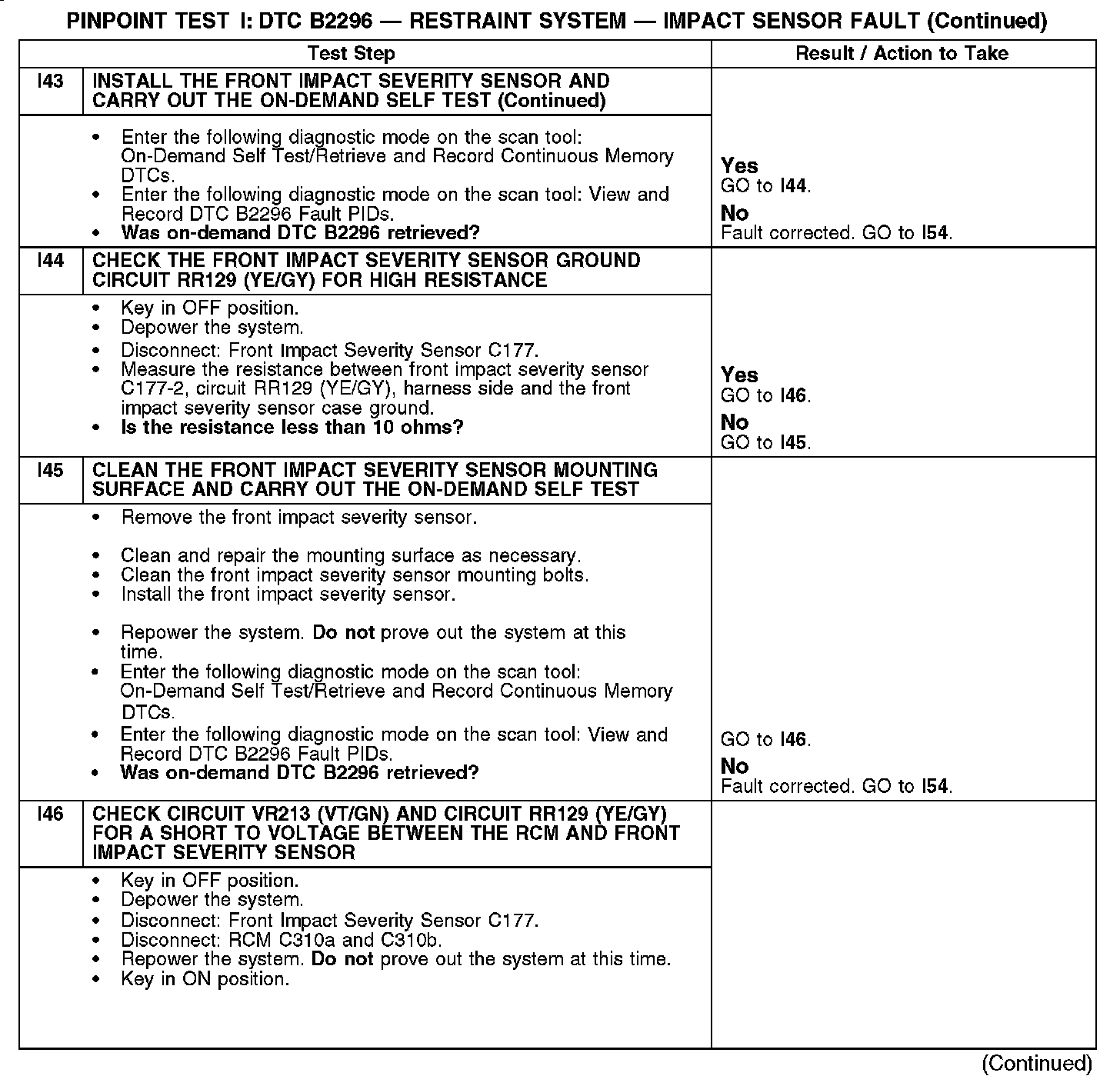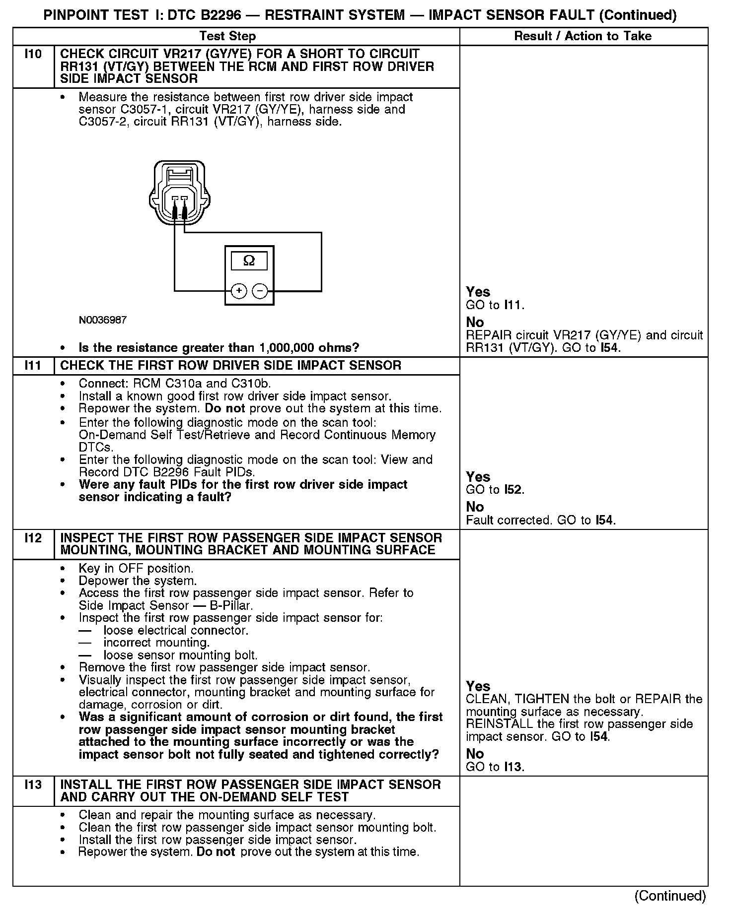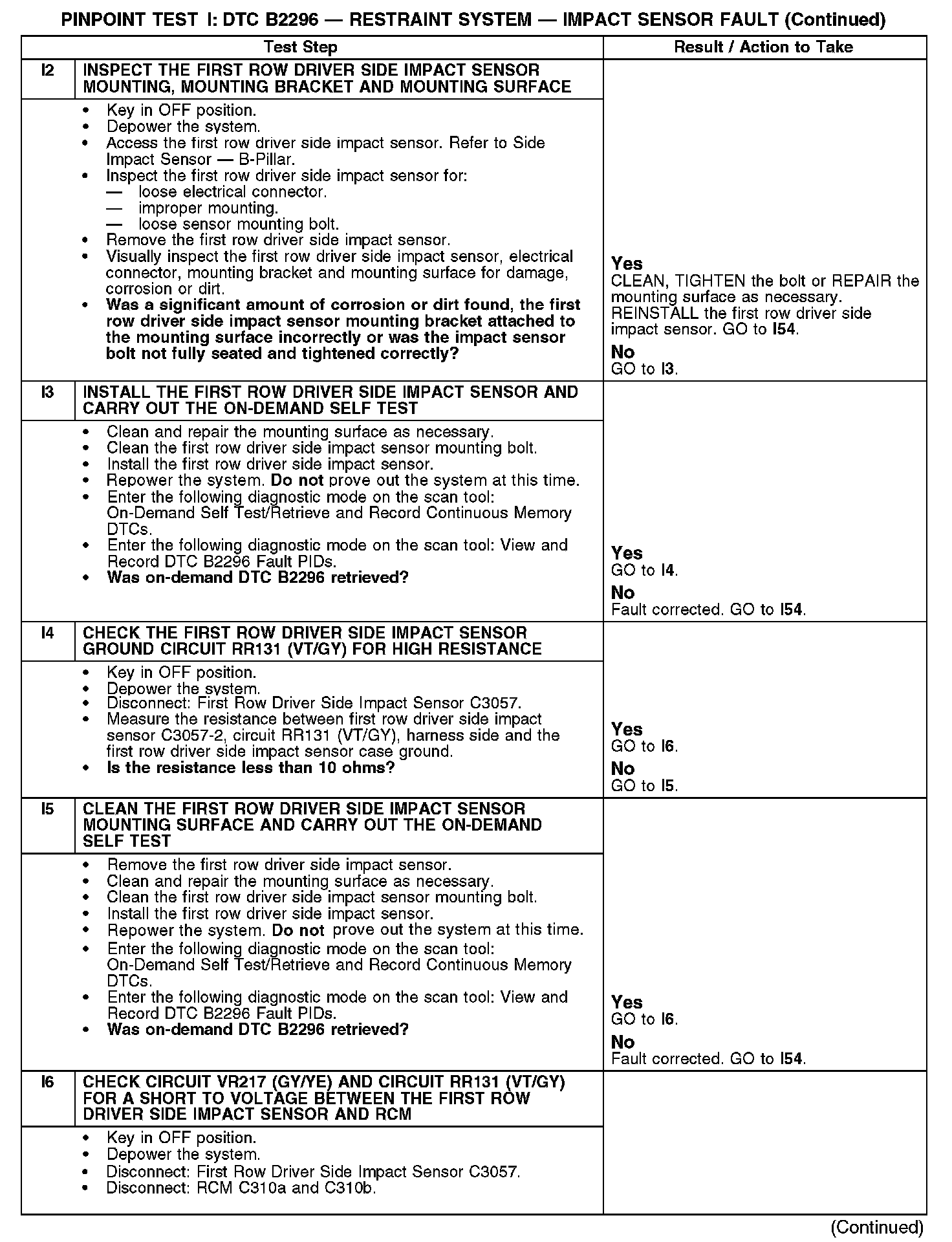 PINPOINT TEST I: DTC B2296 - RESTRAINT SYSTEM - IMPACT SENSOR FAULTI1: