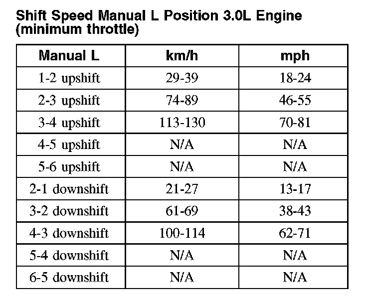 Shift Speed Manual L Position 3.0L Engine (Minimum Throttle):