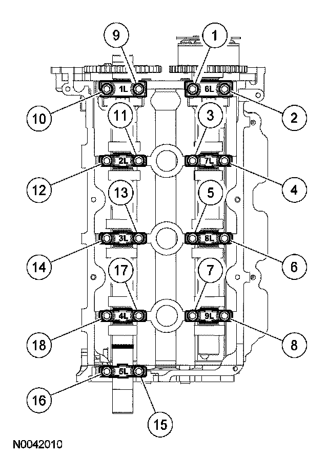 Tighten the LH camshaft bearing cap bolts in the sequence shown to 10 Nm (89 inch lbs.)