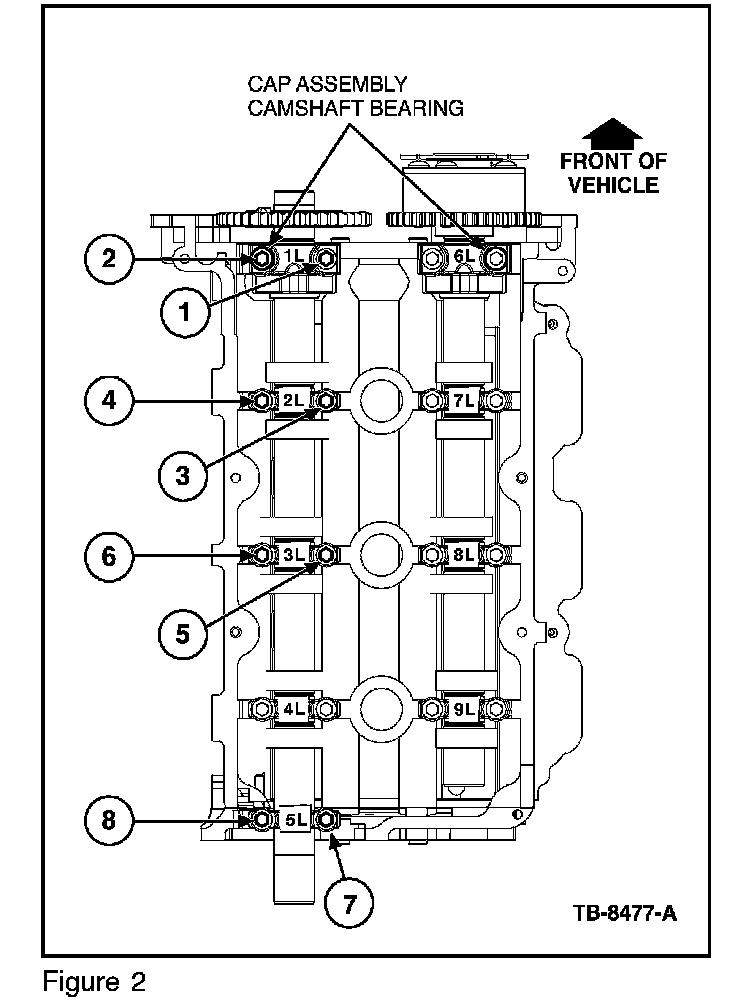 4. Torque bolts in sequence as shown in Figure 2, to 72 lb-in (8 N.m) excluding cam cap number 4L camshaft cap.