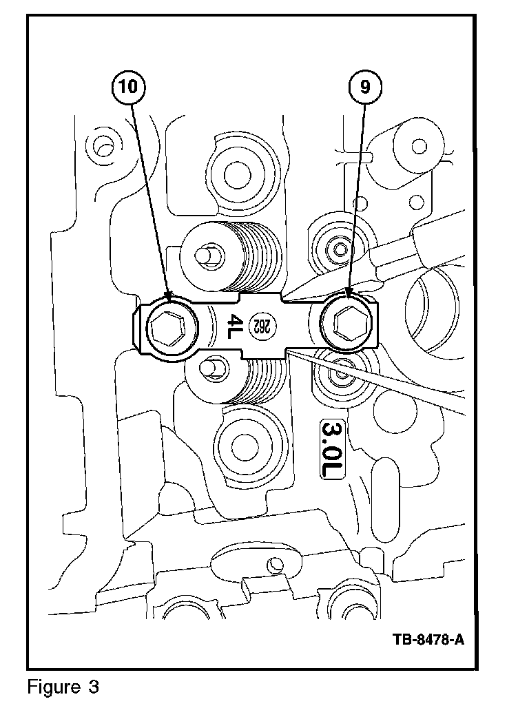 6. While holding cam cap number 4L in the shifted position, torque the fastener number 9 (inboard) first, to 72 lb-in (8 N.m) then torque fastener number 10. (Figure 3)
