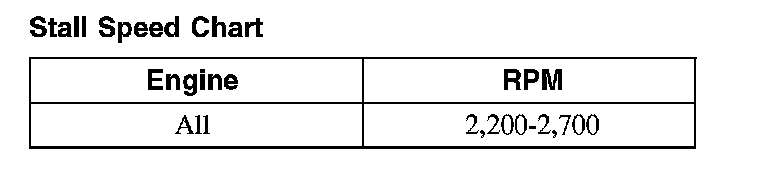 Press accelerator pedal to floor (WOT) in each range. Record rpm reached in each range. Stall speeds should be as follows: