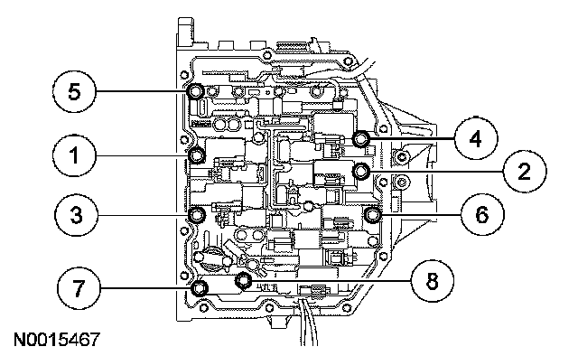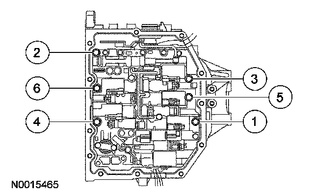 10. Remove the 6 main control valve body bolts in the sequence shown.
