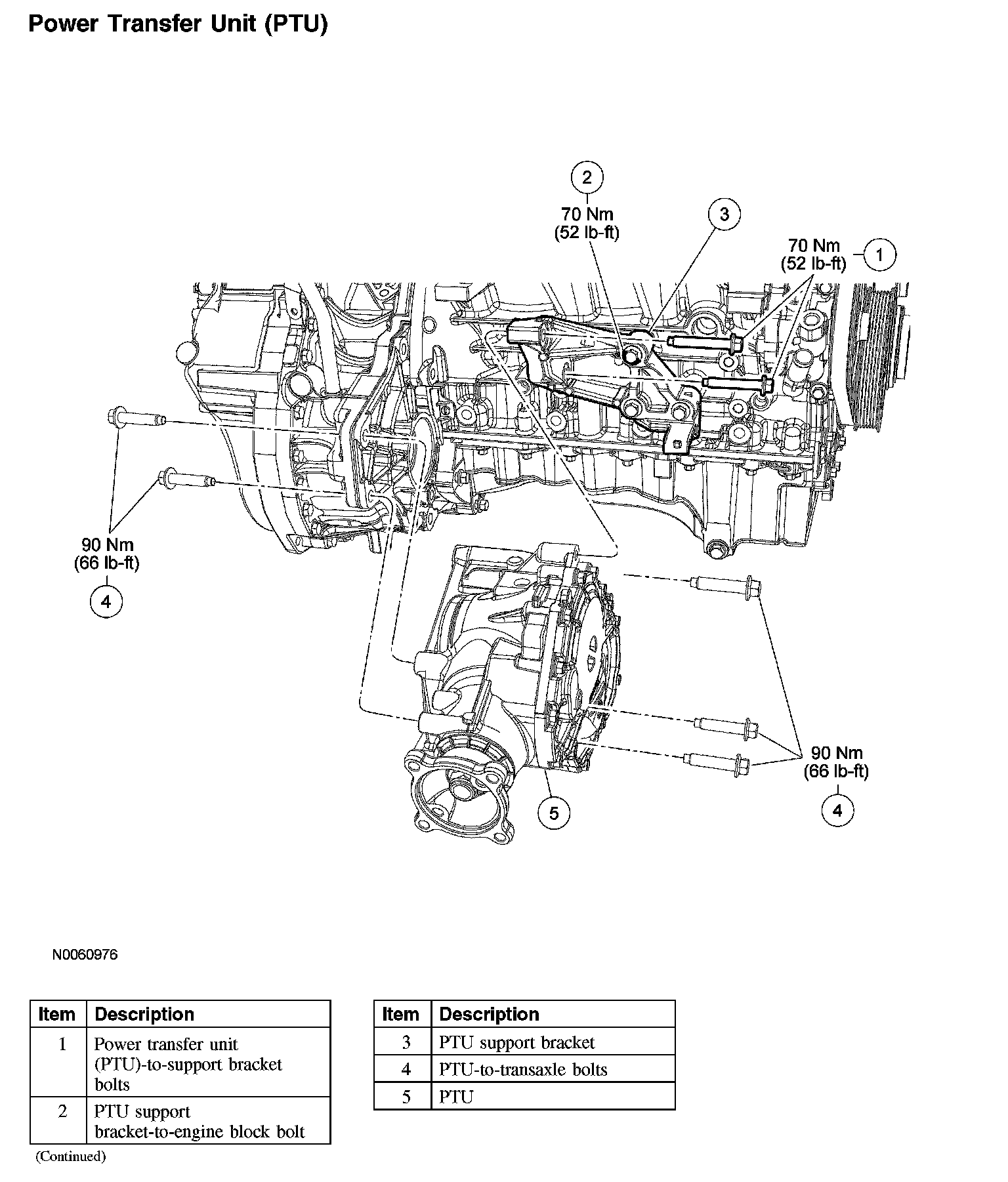 Position the power transfer unit (PTU) to the transaxle. Install the 5 PTU-to-transaxle bolts.