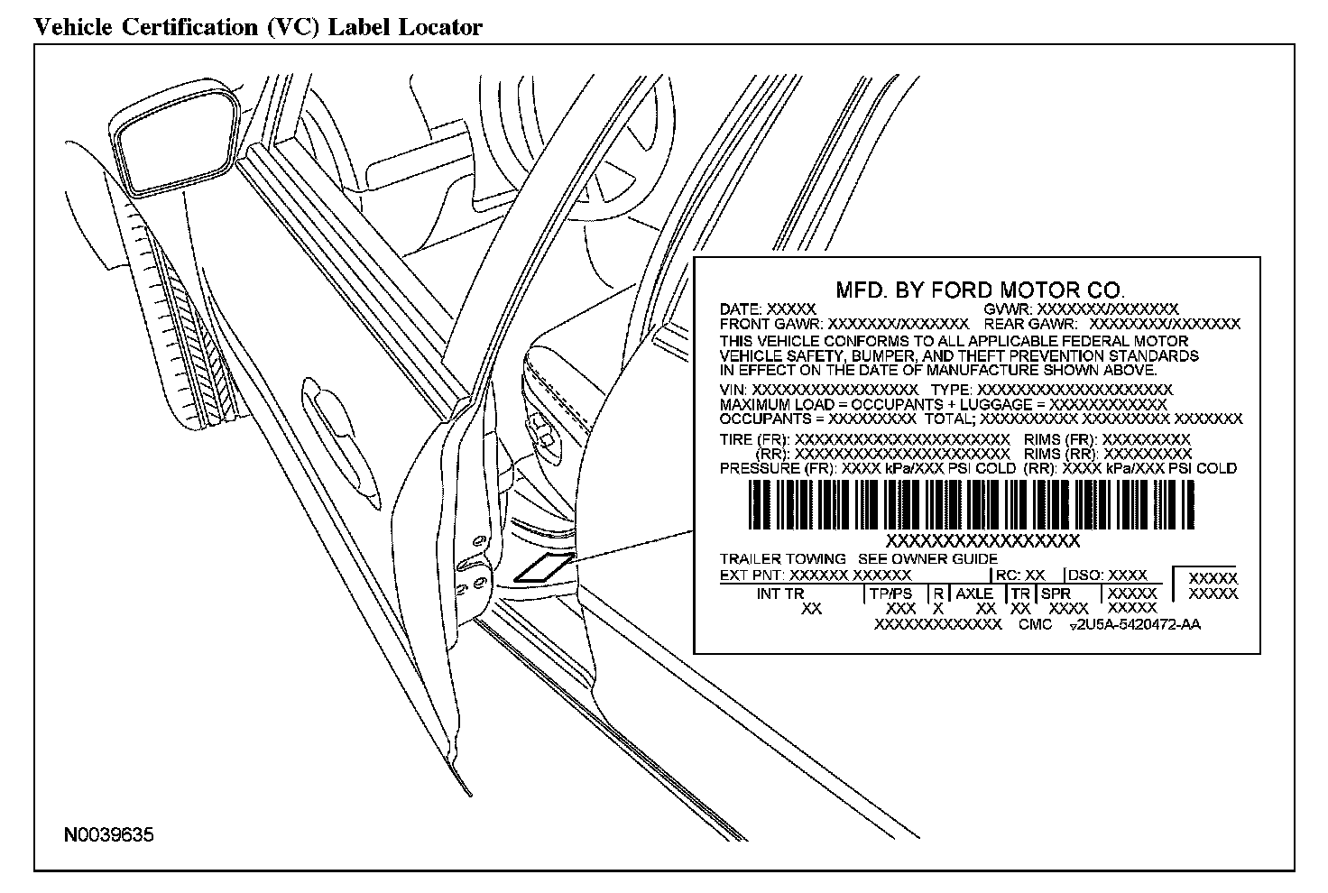 The upper portion of the vehicle certification (VC) label contains the manufacturer's name, the month and year of manufacture, the certification statement and the VIN. It also includes gross vehicle weight rating (GVWR). The VC label is located on the left-hand door jamb.
