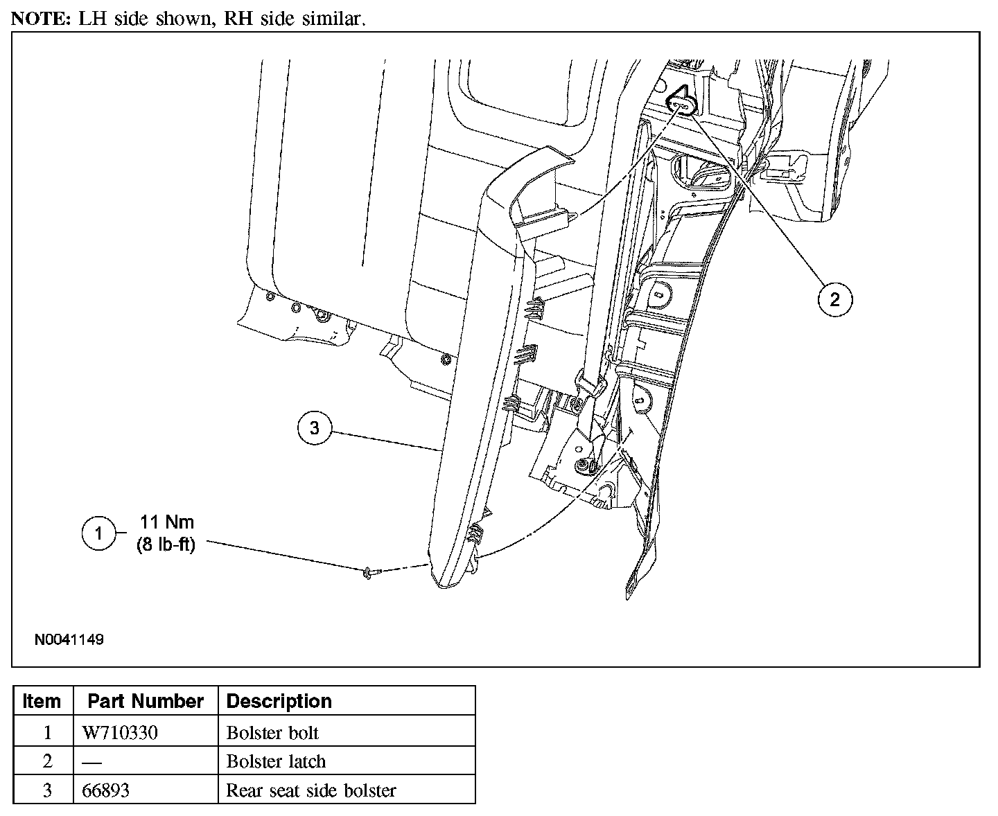 To remove the LH side bolster, use a hooked pick or fashion a hooked tool to pull the latch release toward the RH side of the vehicle and release the side bolster.