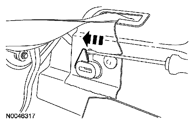 To remove the RH side bolster, use a flat-blade screwdriver to push the latch release toward the RH side of the vehicle and release the side bolster.