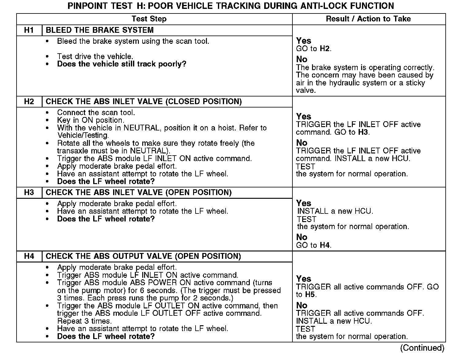 Pinpoint Test H: Poor Vehicle Tracking During Anti-Lock FunctionNormal Operation