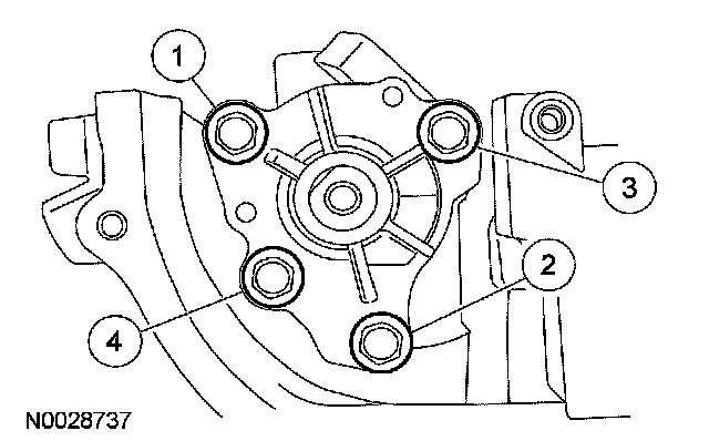 Install the oil pump assembly. Tighten the 4 bolts in the sequence shown in 2 stages: