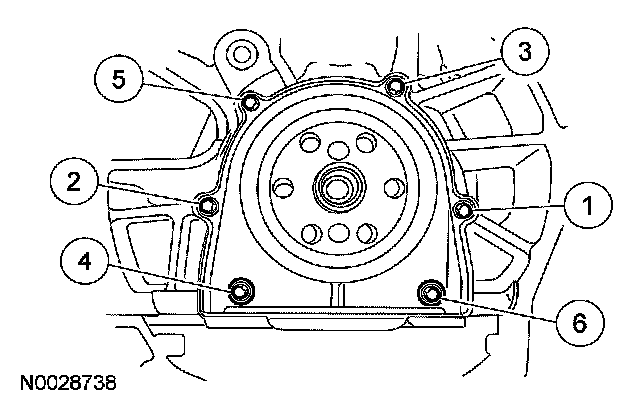 34. Tighten the 6 crankshaft rear main oil seal bolts in the sequence shown.
