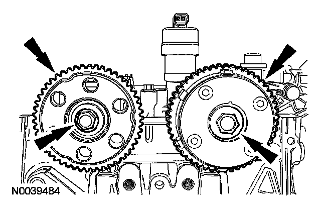 Using the flats on the camshafts to prevent camshaft rotation, tighten the bolts.