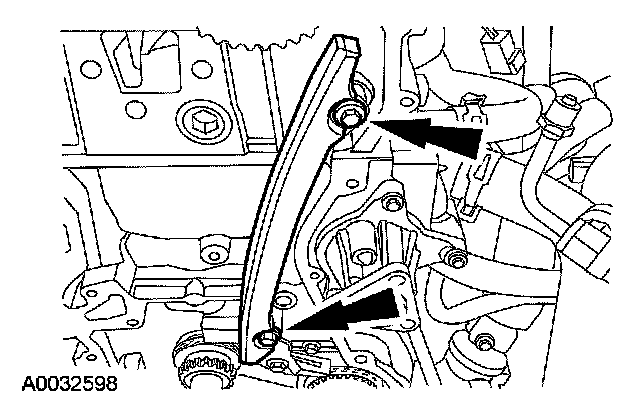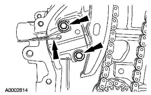 62. Install the timing chain tensioner and the 2 bolts. Remove the paper clip to release the piston.