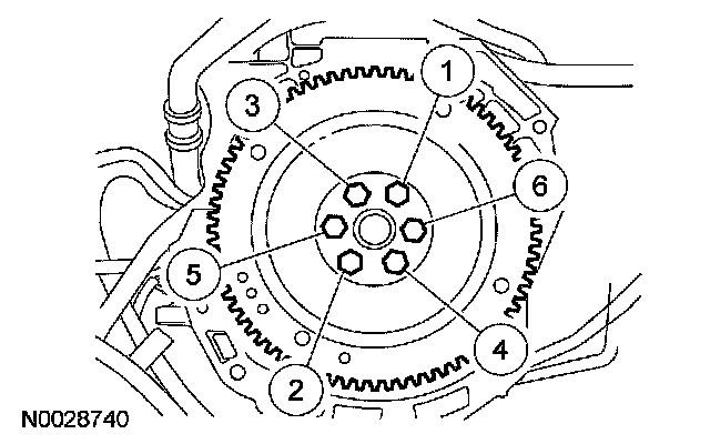151. Install the flexplate and the 6 bolts. Tighten the 6 bolts in the sequence shown in 3 stages: