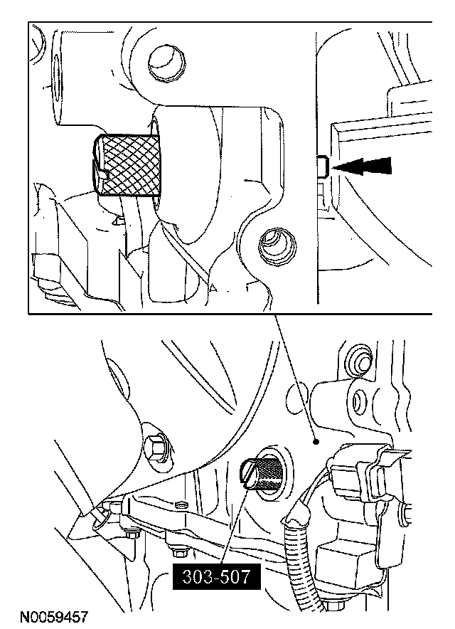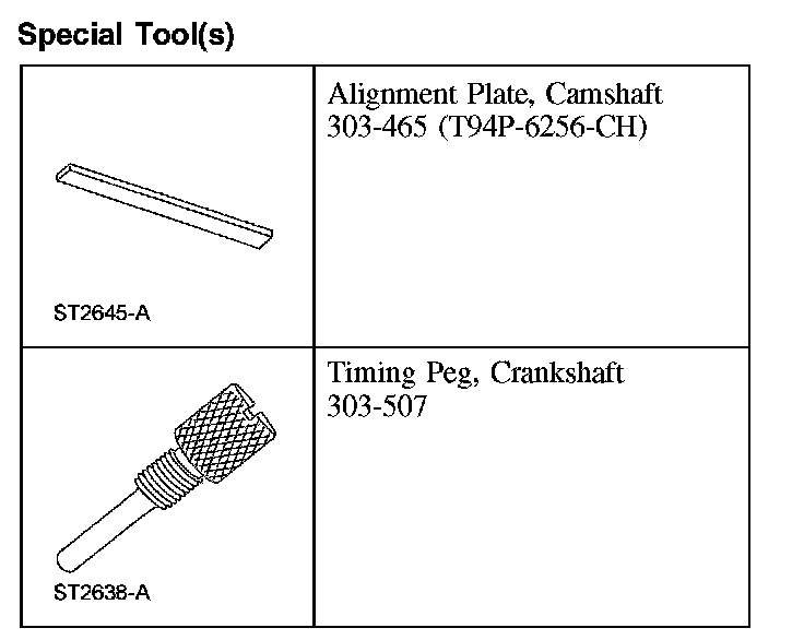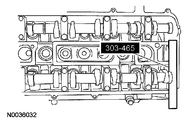 7. CAUTION: The special tool 303-465 is for camshaft alignment only. Using this tool to prevent engine rotation can result in engine damage.