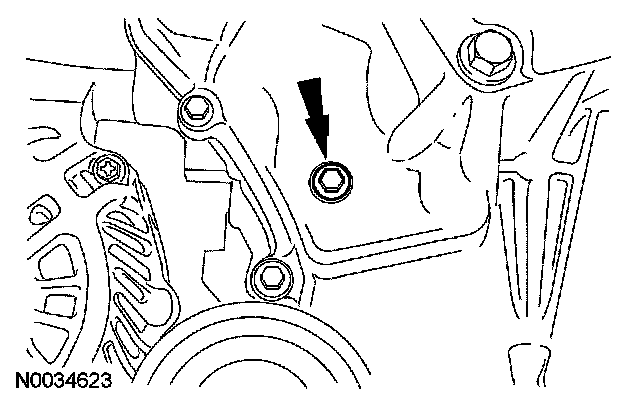 Remove the M6 x 30 mm (1.18 inch) bolt from the upper front cover timing hole to release the tensioner arm.