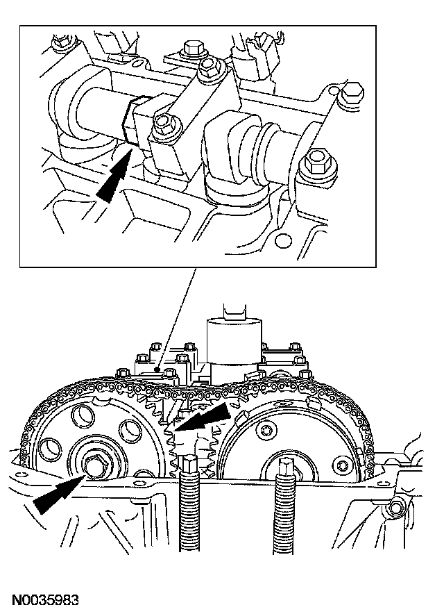 ^ Have an assistant rotate (using the flats of the camshaft) the exhaust camshaft clockwise to collapse the timing chain tensioner plunger.