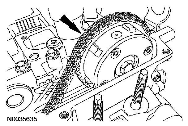 6. NOTE: Releasing the tensioner arm will remove the slack from the timing chain.