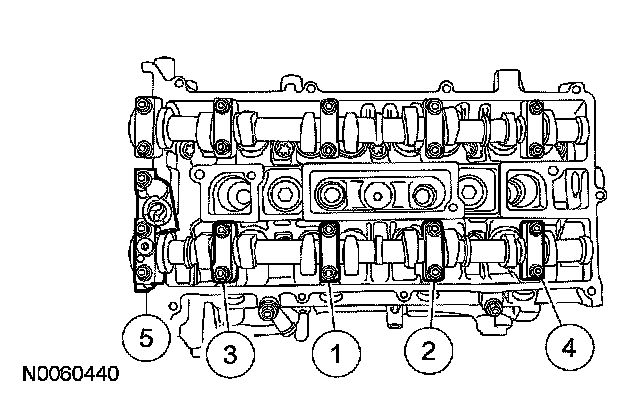 Install the intake camshafts and bearing caps. Tighten the intake camshaft bearing caps in the sequence shown in 3 stages: