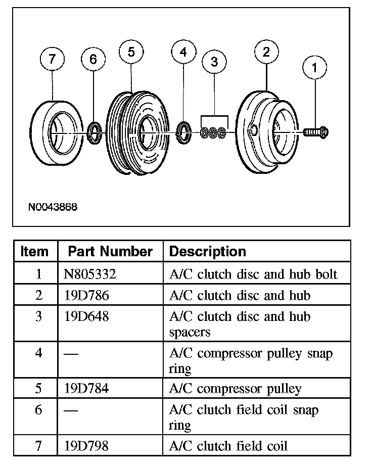 - Internal A/C compressor components are not serviced separately. The A/C compressor is serviced only as an assembly. The clutch disc and hub, A/C compressor pulley and bearing and clutch field coil are serviceable.