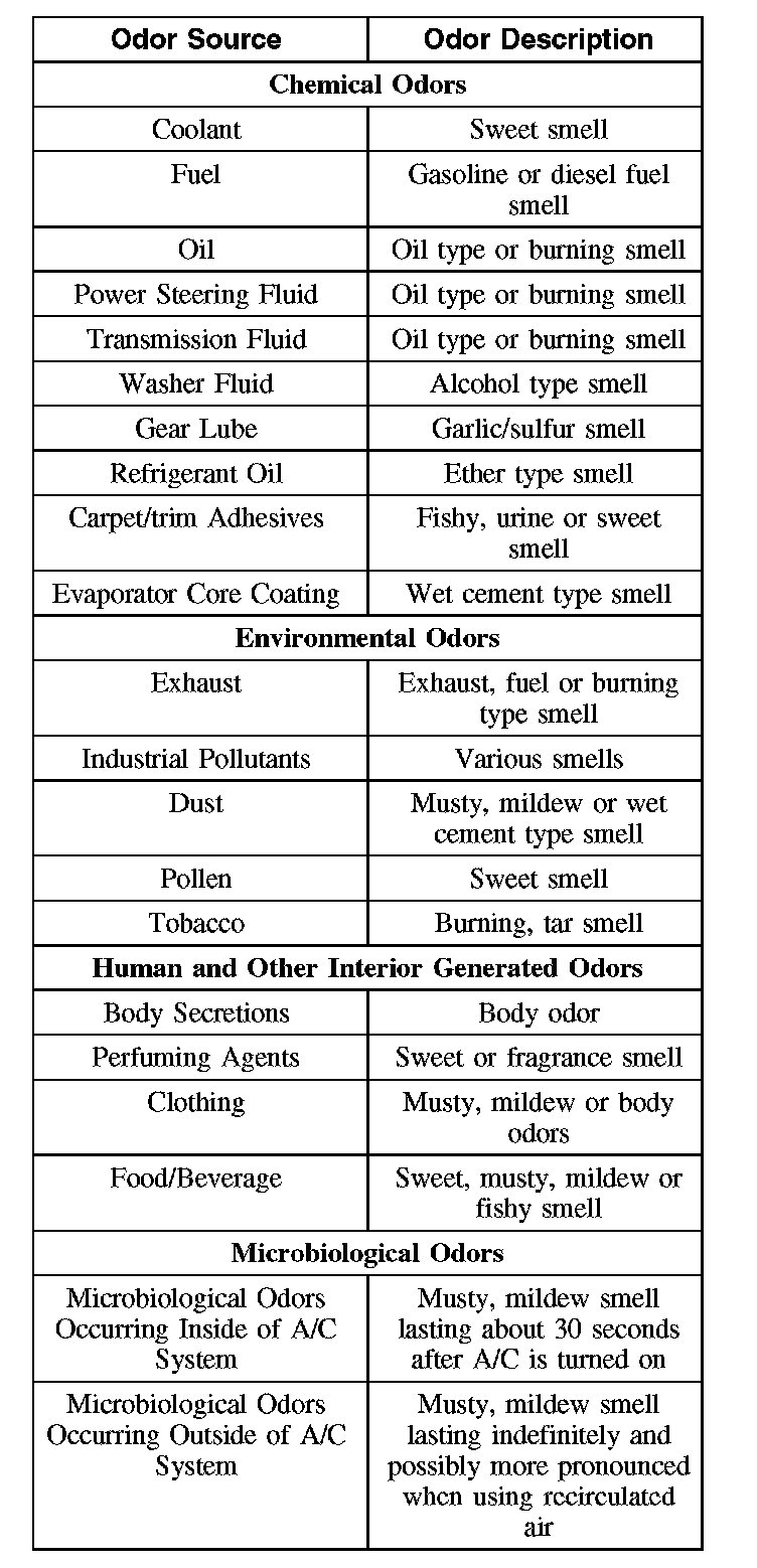1. Identify the type of odor present in the vehicle. Do not proceed with A/C odor treatment if the odor source is found to be outside of the A/C system. Refer to the chart for examples.