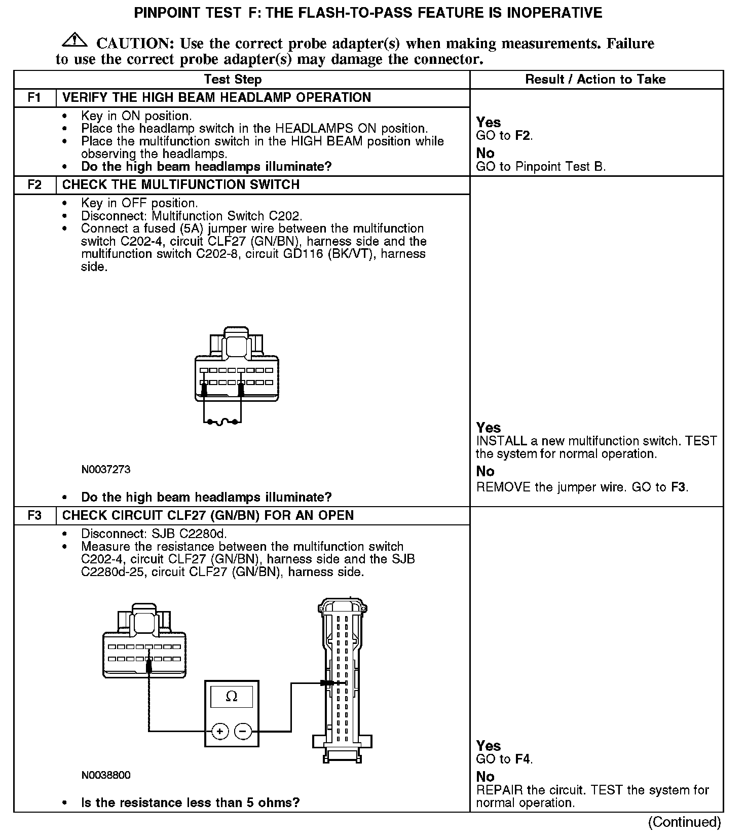 The smart junction box (SJB) sends a reference signal to the multifunction switch through circuit CLF27 (GN/BN). When the multifunction switch is placed in the FLASH-TO-PASS position, the voltage signal is routed to ground. When the SJB detects a request for the flash-to-pass, the SJB sends voltage to the high beam headlamps.