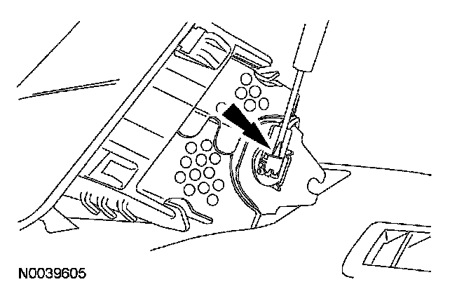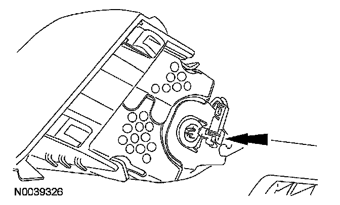22. From under the rear of the passenger seat, slide and disengage the passenger seat side air bag module electrical connector locking clip, and then release the tab and disconnect the passenger seat side air bag module electrical connector.