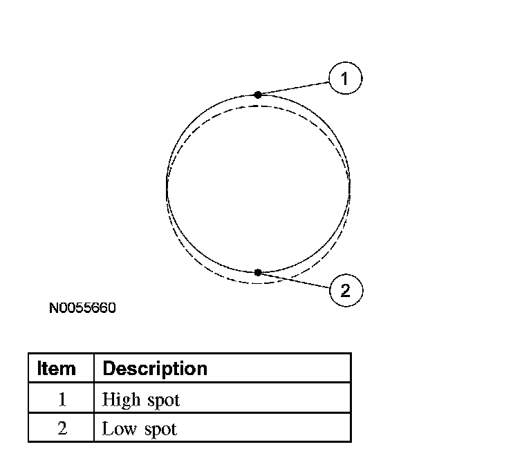 6. If the second high spot is still above specification and is within 101.6 mm (4 inch) of being opposite the first high spot on the wheel, the root cause is probably the wheel (the high spot followed the wheel). Dismount the tire from the wheel, mount the wheel on a balancer and check the wheel runout. Install a new wheel if the wheel runout exceeds 1.27 mm (0.050 inch).