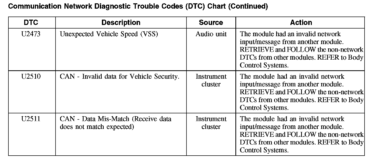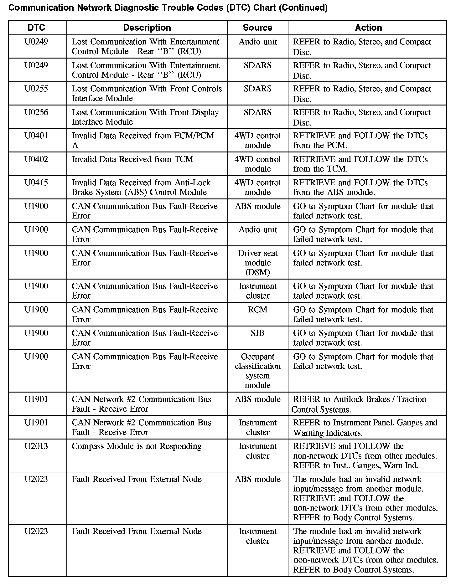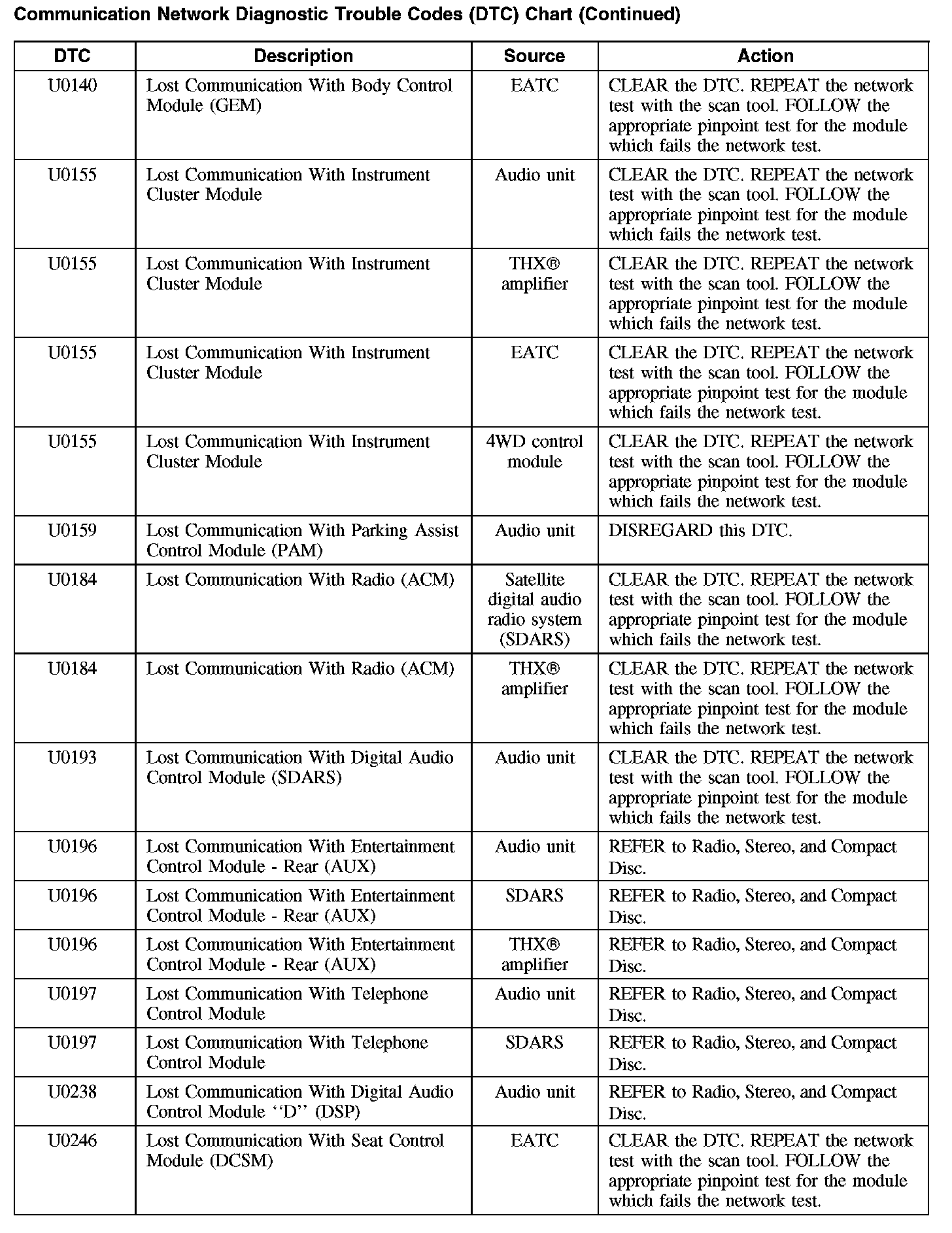 Communication Network Diagnostic Trouble Codes (DTC) Chart