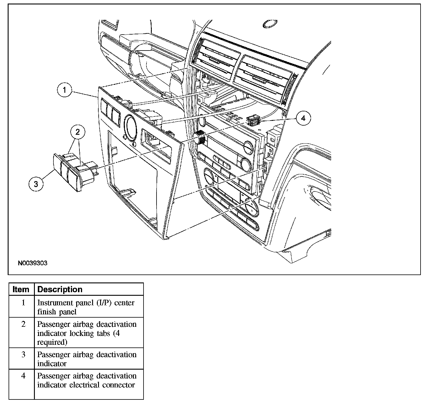 4. Release the 4 locking tabs (2 upper and 2 lower) on the passenger airbag deactivation indicator and remove it from the I/P center finish panel.