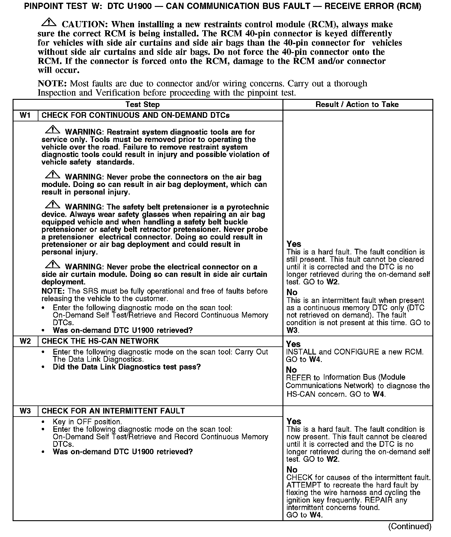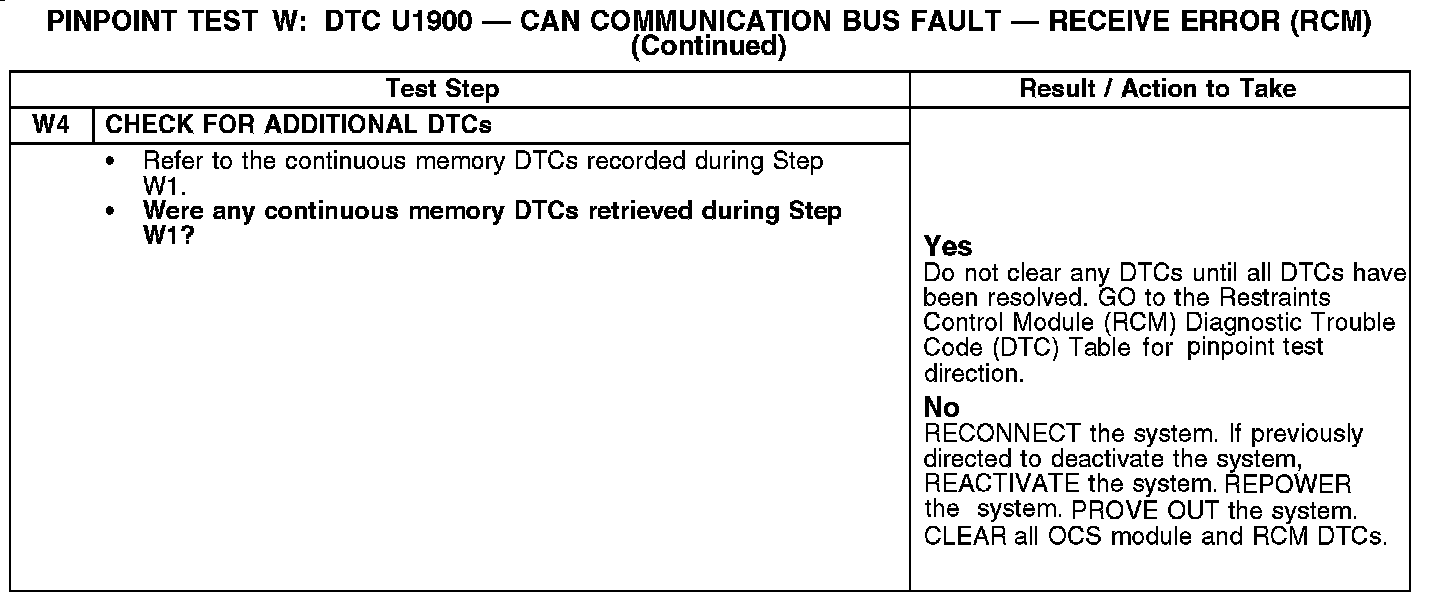 PINPOINT TEST W: DTC U1900 - CAN COMMUNICATION BUS FAULT - RECEIVE ERROR (RCM)W1-W3: