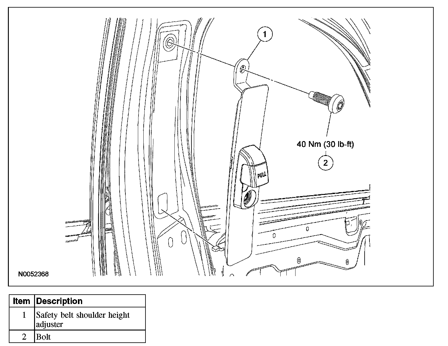 3. NOTE: Position the safety belt shoulder height adjuster DOWN to access the bolt.