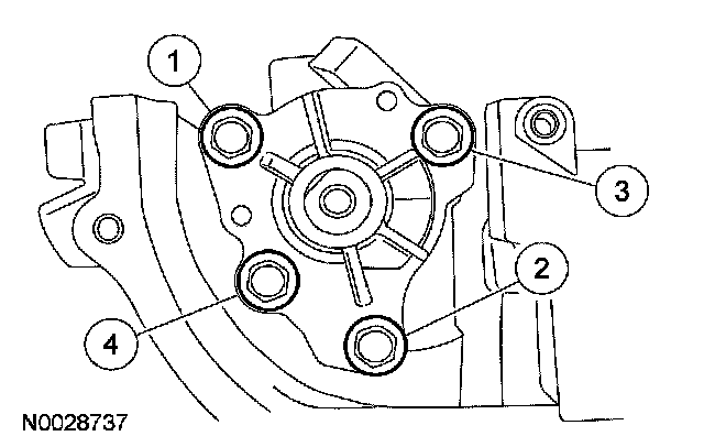 Install the oil pump assembly. Tighten the 4 bolts in the sequence shown in 2 stages: