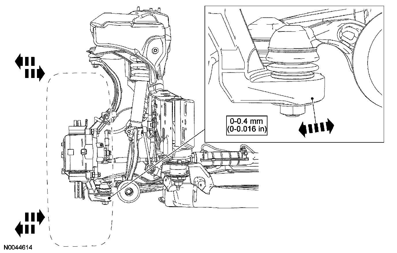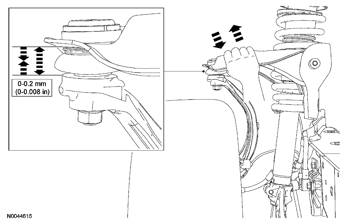 4. CAUTION: Do not use any tools or equipment to move the wheel and tire assembly or suspension components, while checking for relative movement. Suspension damage can occur. The use of tools or equipment will also create relative movement that may not exist when using hand force. Relative movement must be measured using hand force only.