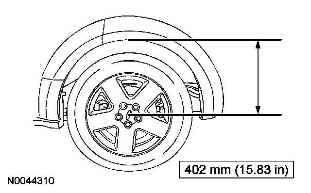 11. CAUTION: Before tightening any suspension bushing fasteners, the suspension must be at the bushing fastener tightening position. Use a suitable jack to raise the suspension until the distance between the center of the hub and the lip of the fender is equal to 402 mm (15.83 inch).