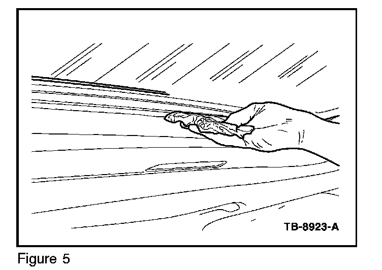 7. Use Motorcraft� Metal Sur[ace Prep to clean and wipe the center part of the roof opening frame glass. (Figure 5)